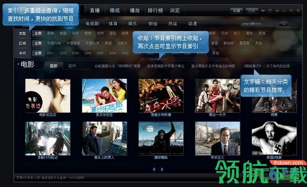 2.详细节目列表。提供多频道四日的详细节目列表及正在直播的节目列表。