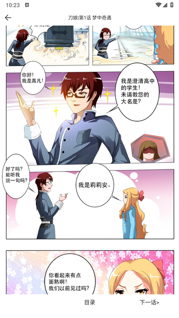 2. 阅读操作- 点击漫画封面进入阅读界面,支持上下滑动翻页。- 点击目录可跳转章节,长按屏幕可调整亮度、画质等参数。