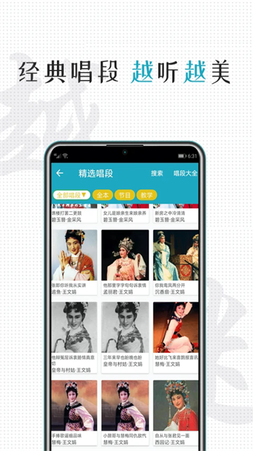 既有天上掉下个林妹妹、想当初妹妹从江南初来到、葬花、十八相送、楼台会、金玉良缘、时辰八字排分明等唱段音频,也有梁山伯与祝英台、红楼梦、西厢记、苏三起等全本舞台剧大戏折子戏、戏曲电影电视剧。不仅可以听音乐、听故事、听历史,还能学唱戏、学表演、学身段舞蹈,更有戏曲电视节目可以收看,资源非常丰富。