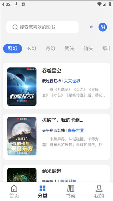 3、点击分类页面,这里将小说进行了详细的归类,包括言情、都市以及武侠等类型