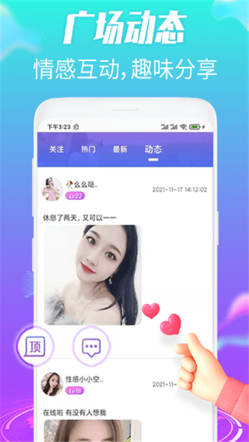 3、广大年轻人都汇聚到了这里,还可以在广场上自由分享自己的动态,感受更多社交乐趣。