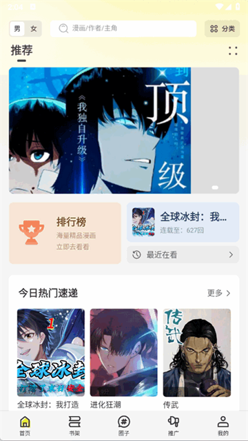 一款好用无广告的漫画阅读器,它可以根据你的喜好来进行推荐,还能直接搜索你喜欢的漫画,同时提供了书架,推广,圈子等多个板块内容,软件为用户精心准备了超多的人气漫画资源,都是各大网络平台上阅读人数超多的热门漫画,为了满足用户追漫的需求,软甲漫画漫画更新速度极快,实时更新最新剧集。