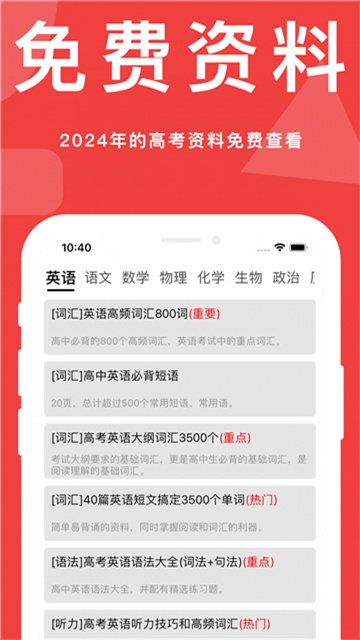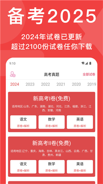 它是一款专注于为高考生提供真题模拟的软件,专为一千万高考生服务,收录了全国各地高考的试卷题目,试卷类型涵盖了高考包括文理综在内的所有科目,让你可以针对性的提升与成长,英语,语文,数学,化学,生物,物理等学科对应的试卷应有尽有,不同地区的试卷都包含起来,可以随时联系,助力学子备战高考。