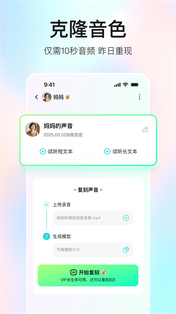 2、专属声音模型:利用深度学习和语音合成技术,基于上传的亲人音频资料,生成一个个性化的声音模型。复刻的声音让用户在现实生活中再次听到亲人的音色,带来温暖的回忆。