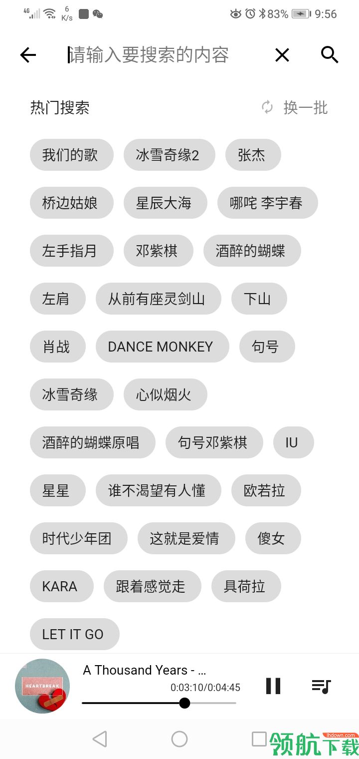 4、点击搜索栏搜索歌曲,点击播放就能听
