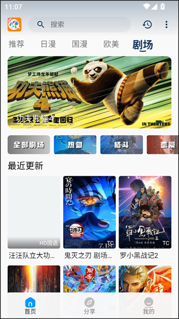 1、打开软件,我们能够看到超多不同的板块,比如说:推荐、日漫、国漫、欧美、剧场等。