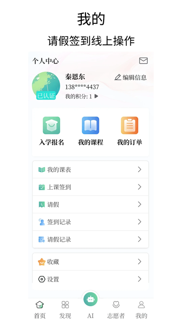 首页的多功能按钮,可以快速定位到自己需要的功能,报名、课表、请假、打卡等等,以最优质的方式满足的您的需求。