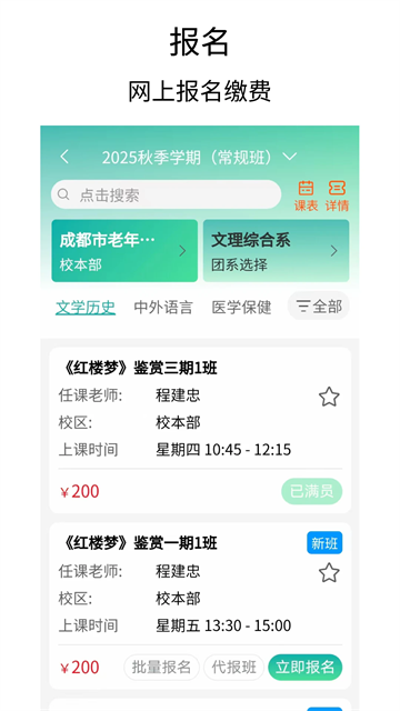 我们的APP可以选择不同的老年大学进行报名,在每个老年大学中都有不同的专业、课程供您选择,您可以根据您自己的喜好来进行抉择,不断丰富您的老年生活