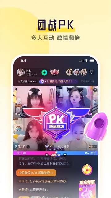 支持实时弹幕聊天、礼物打赏和连麦互动,用户可发送"梦幻城堡"等200+种虚拟礼物,触发全屏特效。直播间内设有PK对战模块,主播可发起1V1或团队竞技,观众通过赠送礼物支持心仪主播,胜负结果实时展示。