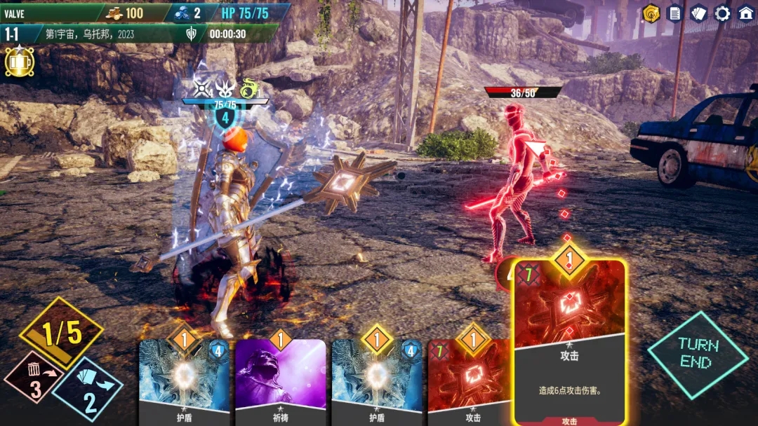 正经一点,角色们都只有5费,每张卡牌的攻击力也只有10点左右,而精英怪的血量都会超过100以上,老老实实平A几乎必败。设计者为玩家安排了特殊的杀敌套路:同颜色的牌组会产生连携效果,杀伤力翻倍的上升,扩张伤害是必备技能之一。策略性或者说赌博在这类游戏中也是关键,当面对BOSS,是选择保存实力等待强力卡牌,还是一波梭哈博个单车变摩托,则很能体现玩家的个性,也是游戏多样性的体现。