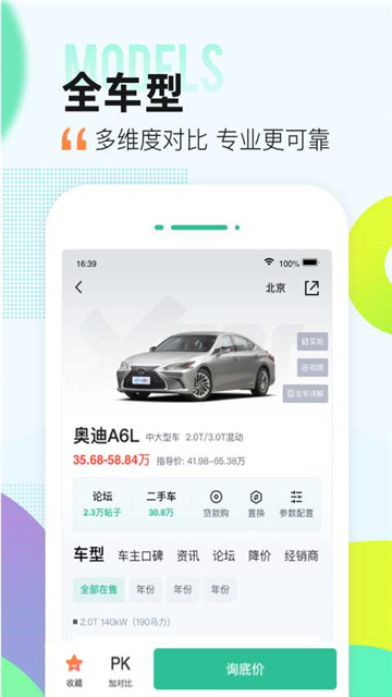 1、车型:您可按照汽车品牌方便快捷地查看车型配置、图片、报价、经销商等信息。