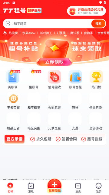 tt租号app是一款很好用的租号软件,用户在这里可以租到各种游戏的账号,如何用户喜欢一个皮肤或者武器不想买,就可以在这里租个账号体验一下这个皮肤或者武器的感觉,想体验王者号也可以来这里,可以满足不同用户的需求,而且安全有保障。