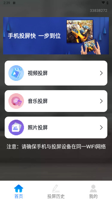 手机投屏快App这款投屏服务软件随便用户们在这里使用的,在这里用户们就放心的使用自己所需的投屏服务用户们只管在这里使用就好了,通过应用可快速和投屏设备匹配连接,并能通过手机端自由选择投屏文件投放观看,帮助用户日常看剧观影更加简单方便,需要的朋友们快来下载吧。