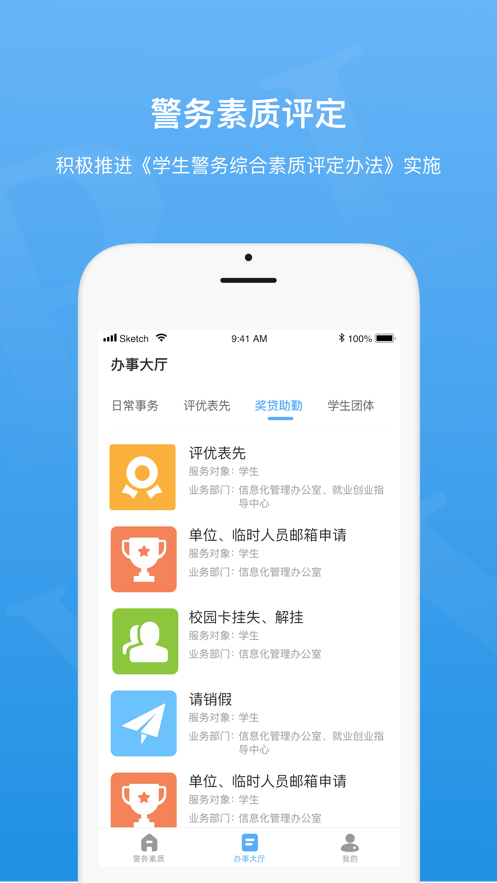 警务素质评定app是一款评定系统软件,其主要是为学生用户打造的综合素质评定服务,用户可以获得到更加规范的评定流程,促进综合素质评价提升等服务,有需要的朋友现在就来下载吧!