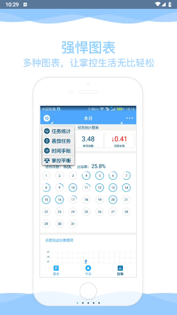 2、强大的图表:目前拥有任务统计、番茄任务、时间手账、掌控平衡四类统计图表,适合各个阶段各种爱好的时间管理爱好者使用。