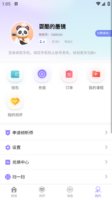 熊猫倾诉是一款非常实用的心理健康辅助工具,它为用户提供了全面的心理咨询服务,帮助他们解决情感、压力等各种心理问题。它不仅有丰富的功能和专业的咨询师资源,还注重保护用户的隐私,确保每一位用户都能安心求助。无论是需要情感指导、心理测试,还是想和专业咨询师进行一对一交流,熊猫倾诉都能满足你的需求。