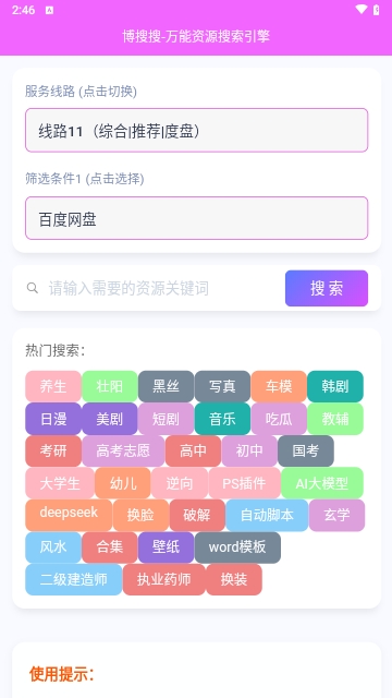 博搜搜为大家提供的网盘磁力资源搜索服务是非常可靠的,支持超多种不同类型的网盘资源搜索,能够很好的满足大家不同的搜索使用需求,还有超多线路提供给大家来进行相关的使用,你可以随意切换,此外还有许多搜索热词提供给大家快捷输入。