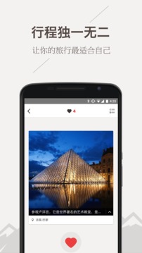 1、一键搞定自由行,只需输入出境游意向目的地、旅行天数、旅行人数、价格期望,旅行君就能为你设计出适合你的旅行方案。比如,你要去法国旅行,那么只需简单的设置,就能生成法国自由行路线、每一天的详细行程安排、交通衔接等,大大省却自己做出国旅行攻略的时间
