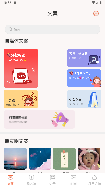 文案句子库是一款集诗词、句子、朋友圈火爆文案、网易云热评、抖音文案、名人名言、经典台词、座右铭、祝福语、优美摘抄于一体的句子文案作文素材APP。同时提供朋友圈不折叠输入法的功能,让你发圈不再折叠。