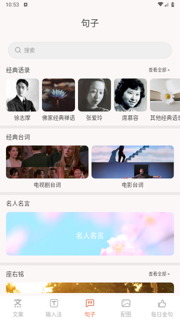 句子:名人名言、每日一言、励志座右铭、减肥座右铭、经典电视台词、电影台词、祝福语一应俱全,还可手动搜索你想要的文案。