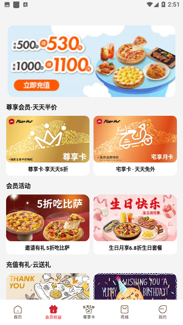 必胜客APP是一款非常优质的手机美食软件,用户通过软件可以找得到各种精美的食品,各种特色热销的美食都能在这里找到,并且分类也很齐全,总能找到自己喜欢吃的。而且软件为用户推荐各种优惠信息,让大家可以吃的更实惠、更满足。在线办理尊享会员卡,享受更多特权实惠。