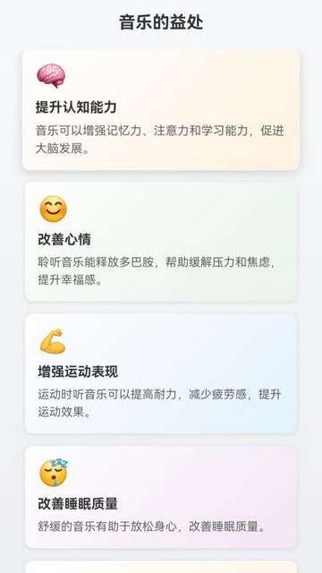 5、用户还可以查看音乐的好处,了解更多的音乐知识,轻松改善心情。