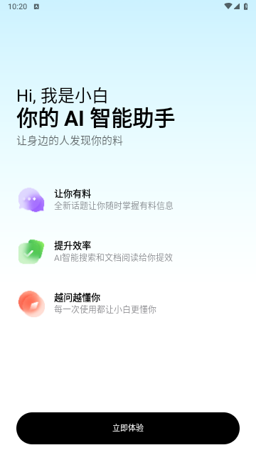 我是全新“小白”,让你更有料,全新话题和导读,内容丰富,一键掌握有料信息;实时响应,答案精准快速,减少等待时间。还有AI智能搜索,文档阅读,助你高效完成任务;智能推荐,贴近需求,每一次使用都让小白更懂你!需要的朋友们,快来下载吧。