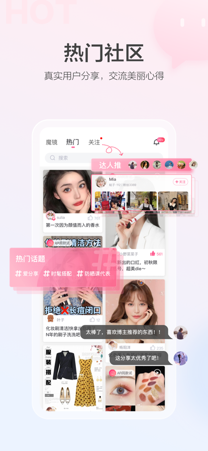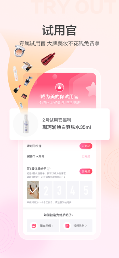 【试用官·福利社】完成每月发帖任务,成为美的你专属试用官,优先体验新品美妆、彩妆、护肤送不停;福利社内更有超多试用、积分兑换活动每日上线,天天有惊喜。【UGC热门社区】海量用户发布原创种草图文和视频,看图刷视频搭配AR试妆,随时随地体验真实妆效。和美粒们一起记录变美的每一小步,交流美丽心得。【AR试妆】- 彩妆单品·冲动剁手前试个妆,新品彩妆色号全,在线试妆让你不花冤枉钱!- 主题妆容·想要尝试流行妆容?每周更新当下热门妆容等你来试!边拍边学,化妆小白也能轻松变美!