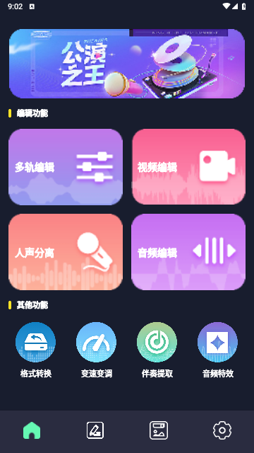 "一款功能强大、操作简单的音频剪辑制作软件;其中包含视频编辑,音频编辑、人声分离、音频格式转换、专业的淡入和淡出效果,伴奏提取等功能同时支持多轨编辑模式,一键合成,简单出色,功能实用,让你轻松玩转音乐!!!"