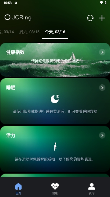 JCRingapp是一款需要搭配智能设备使用的健康监测管理软件,在软件中用户需要将智能设备连接使用,对用户的运动、心率、睡眠等各项数据实时监测记录,并将用户的各项健康数据实时统计直观展示,便于用户随时清楚自己的身体健康情况。
