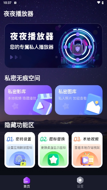 夜夜播放器APP免费版这是一款专注于视频播放器和加密保护功能服务的应用软件,在这里用户能够享受到专属的空间保护,能够进行影视加密、图库保护、密码设置、图标替换以及本地存储视频播放等等操作,以后大家播放和管理私密视频文件将十分便捷。