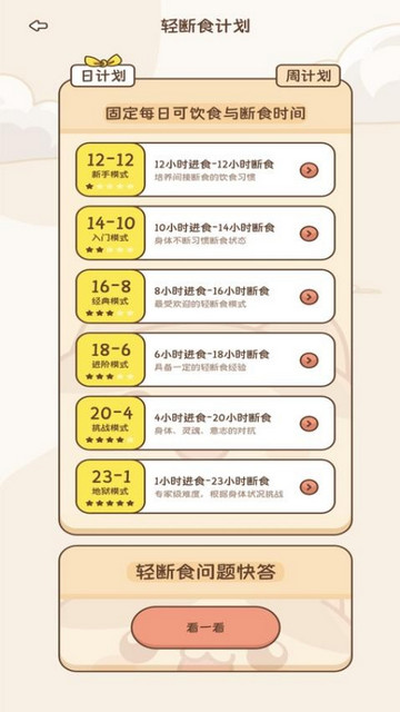 支持自行选择轻断食计划制定,便于能高效规范的断食瘦身,保障身体健康;