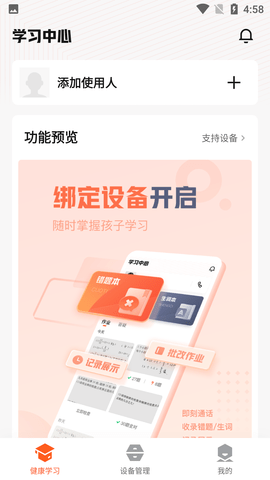 家长可以方便的通过作业帮智能App,绑定/管理作业帮全科学习笔等智能硬件设备。多台设备可接入同一个App,方便管理。