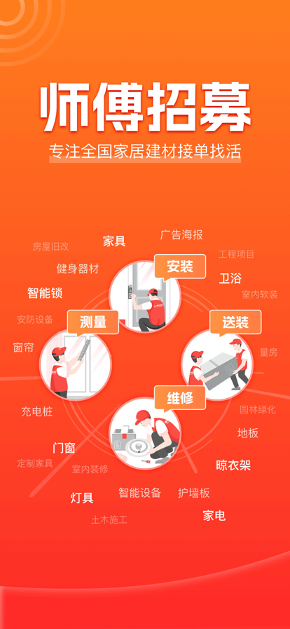 2.商家类型多:平台聚合了家具、家电、卫浴、晾衣架、灯具、智能锁、门窗、健身器材、充电桩、广告海报、智能设备、工程项目等数百万家居商家&千万家庭用户的服务需求,师傅随时随地即可实现服务交易