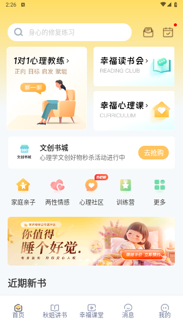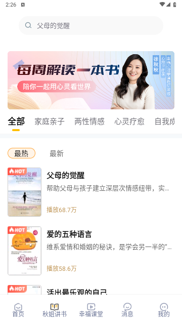 全民幸福社是一款心理咨询服务软件,课程内容丰富、实用性强,适合想要提升自我、学习心理学的用户。软件界面简洁,操作便捷,适合各年龄段的学习者。软件提供了多种学习模式,可以很好地解决各种学习上的问题。有需要的朋友们,快来下载吧。