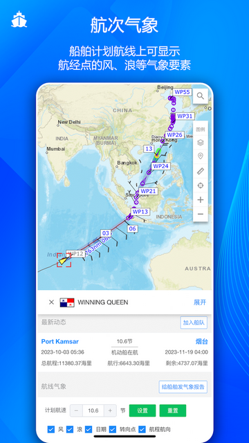 船队在线是专门为航运企业提供管理和信息服务的软件,在线可以进行船队管理,通过地图展示了船队的位置,还可以在线设置多种预警;在线即可查看各种船舶档案,包括当前、历史、计划和资料,选择分类后即可查看列举出的信息;还可以进行航线预测,根据AIS目的港实时预测航线,还在地图中标记了路线;个人用户可以加入船队并共享位置信息,在线即可与船队的成员进行沟通,并查看船队的最新动态;也为用户提供了海洋气象预报和台风预报,提前预警并推送异常天气的消息,让用户及时了解情况。