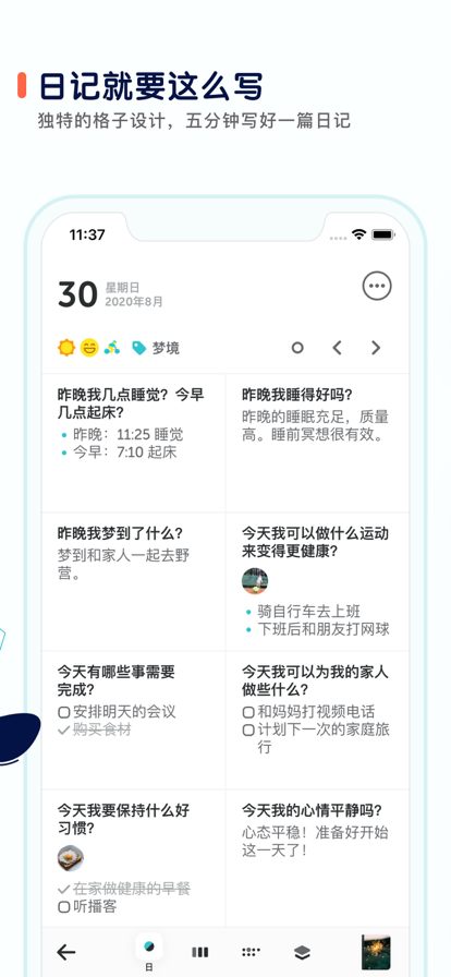 # 你的日记你做主不论你是晨间日记、成功日记、感恩日记、还是子弹笔记的实践者,或者单纯只是想简单记录下自己的心情。格志日记提供了模板库、问题库、习惯打卡、写作提醒等丰富的工具来帮助你定制完全贴合自身需要的日记方式。——格志日记,你个人专属的完美日记系统。【独家特色一】格子形式的日记写作体验格志日记独创强大且灵活的格子形式,聚焦于对你真正有意义的事情,帮助你夺回生活的控制权。你不仅不会无从下笔,甚至还会爱上填格子写日记的充实和满足感。【独家特色二】专业的写作引导库基于积极心理学设计的问题,引导你触碰内心真实的自己。从写下一个答案的那一刻起,你就已经开始行动,迈出了蜕变的第一步。【独家特色三】日/周/月/年维度丰富的时间维度让你的日记真正成为个人成长的底层系统。从诗和远方到脚下的每一步,听从自己内心的节奏展开规划、行动和复盘。一步步分解并实现你的人生目标。