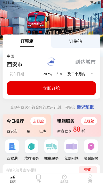 1、在线订舱。可查询长安号班列已开放公共班列舱位,客户也可以提交班列需求,确定班期并在线支付后完成订舱。