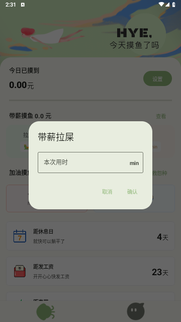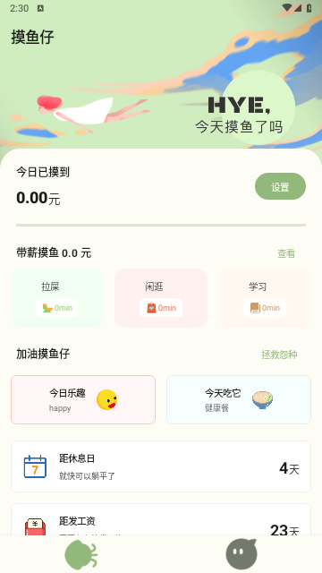 薪资设置:用户可以自由设置薪资,软件会实时统计月薪和工作时间,计算出摸鱼获得的薪资。
