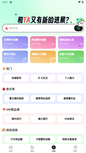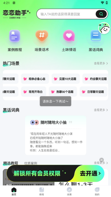 它汇集了大量优质的聊天话术和实用课程,帮助用户在各种社交场合中轻松应对,拥有超多优质的聊天话术供大家进行学习,实用课程等你来学,轻松拉近双方距离,