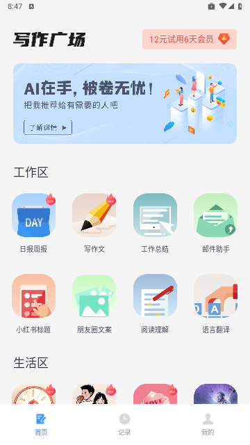 1、用户打开日报周报生成器app,登录进入首页,首页分为工作区(日报周报、工作总结、文案等)、生活区(写情书、毒鸡汤、评价等)两部分,用户点击工作区带的日报周报;