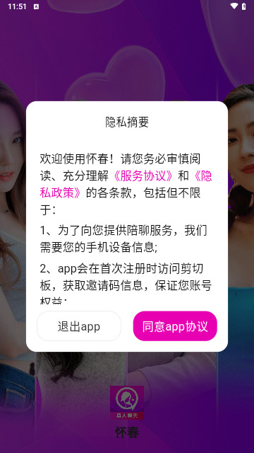 怀春交友App是一款由南宁觅趣科技有限公司打造的一款手机交友服务软件,这款软件中有着很多的单身男女放心的在这里聊天交友就好了,软件中没有任何的门槛限制放心的在这里记性手机交友就好了,绝对能够让用户们在这里找到自会喜欢的人放心的聊天就行了。