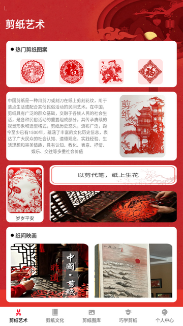4、提供丰富的剪纸教程和技巧指导,帮助掌握剪纸技法;介绍剪纸的历史、文化背景和节日习俗。