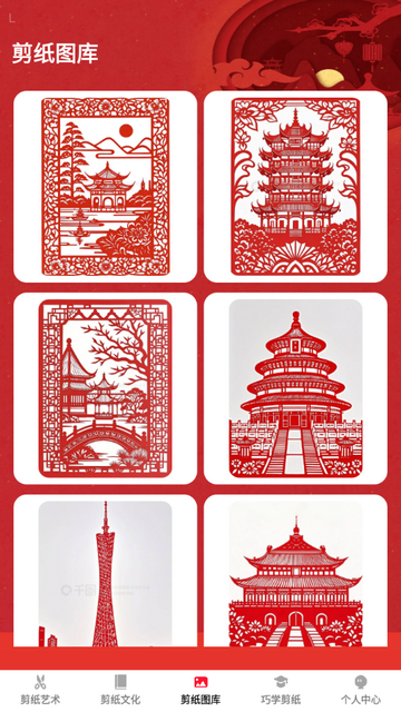 在剪纸图库中可以查看到各种各样的剪纸作品,可欣赏剪纸作品寻找剪纸灵感。