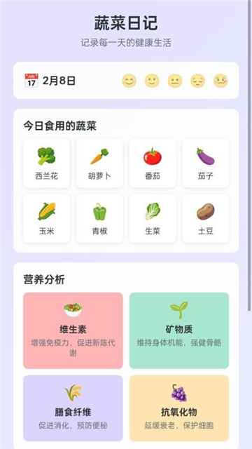 3、支持用户记录每天食用的蔬菜,进行营养分析并提供健康饮食建议,还能记录心情。