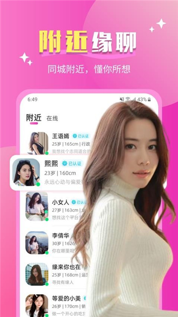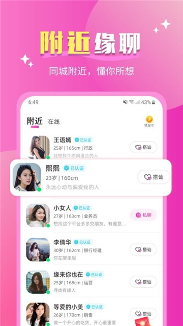 真实可靠的交友平台,所有单身男女都经过严格的审核,保障用户日常交友安全;