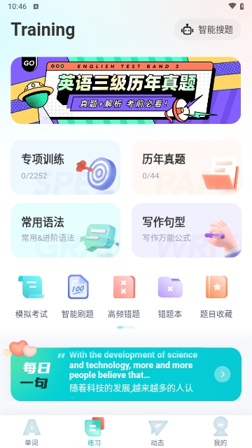 英语三级考试聚题库是一款方便快捷的学习工具,用户只需打开手机即可进行快速练习。这款APP提供了真题考点的全面更新,修复了已知问题,更支持语音和拍照搜题,题库中的试题全真模拟真实的考试,是各位考生学习乃至通过考试的好帮手。