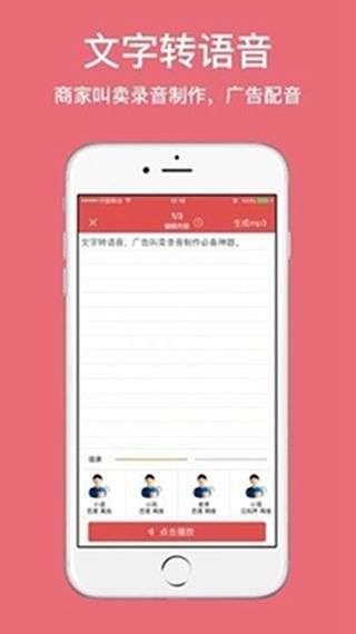 摆地摊吆喝语app是一款技术专业的吆喝手机软件,可立即联接蓝牙音响播放。客户根据摆地摊吆喝语app能够轻轻松松制做合适自身的吆喝语句,服务平台完全免费出示海量配音模版,适用文字转换语音,只需几秒就可以将文档转换成mp3音频文件。