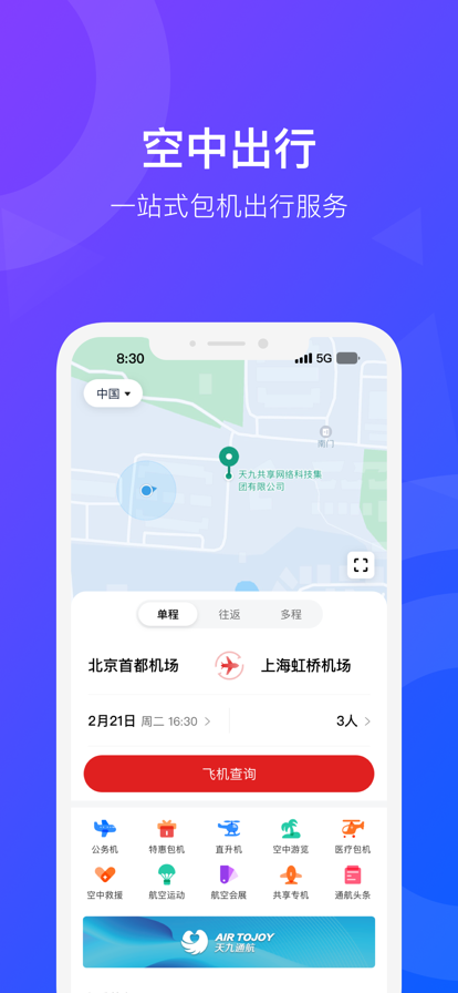 全球通O2O通航服务在线预订平台,秉承“安全、便捷、舒适、尊贵”的私人出行理念,通过智能化共享平台天九通航APP,运用自主创新研发的智能算法,AI及大数据技术,为全球高端会员提供公务机,直升机,商务包机,私人包机,拼机,航空医疗转运,空中救援,飞机购买咨询,二手飞机交易,低空游览,航空运动,航空会展等服务和产品。更为高净值客户提供共享专机以及全方位的商务、智慧、健康、社交等服务。