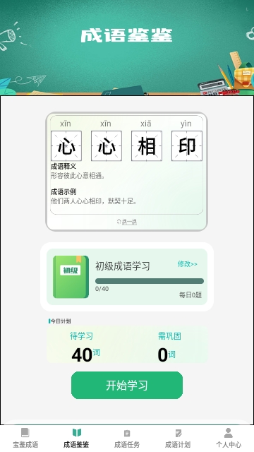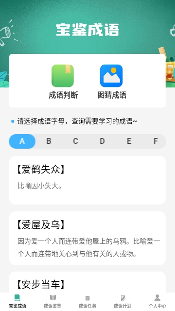 宝鉴成语app是一款专门为成语爱好者提供成语学习服务的软件,软件由宝鉴成语、成语鉴鉴、成语任务、成语计划四大功能模块组成,其中收录了海量的成语词汇可供用户随时查看学习,每个成语都附带有相应的成语释义、拼音、例句等详情信息可供用户更加深入透彻的学习成语。